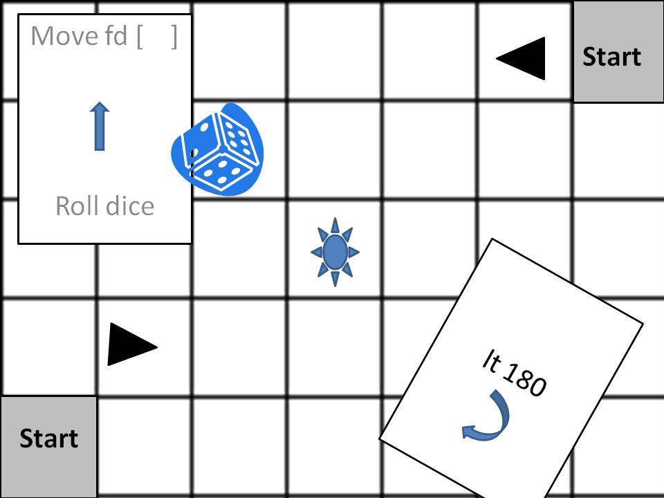 It introduces angles at level 3 ( rt90, lt90, lt45, rt45, lt180, rt180) and also level 3/4 algebra in the form of fd [ ? ]. The forward and backward value is rolled via a dice nicely introducing variables without being too explicit.
